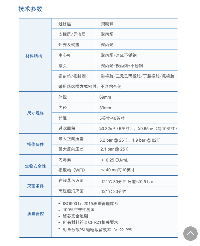科蘭迪過濾PES折疊濾芯聚醚砜膜濾芯采用科學的超親水性能,聚醚砜膜結(jié)構(gòu)非對稱工藝制作而成。非對稱結(jié)構(gòu)擁有深度過濾的特點可分級對不同大小的顆粒雜質(zhì)進行梯度過濾,過濾效率更高納污能力更強;同時聚醚砜膜材質(zhì)擁有較高的耐熱性能夠承受蒸汽消毒較長時間,是食品、醫(yī)藥、電子等行業(yè)的理想選用對象??铺m迪過濾PES折疊濾芯聚醚砜膜通過了工業(yè)行業(yè)中細菌攔截實驗,初始壓差較低流通量增大。