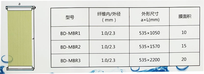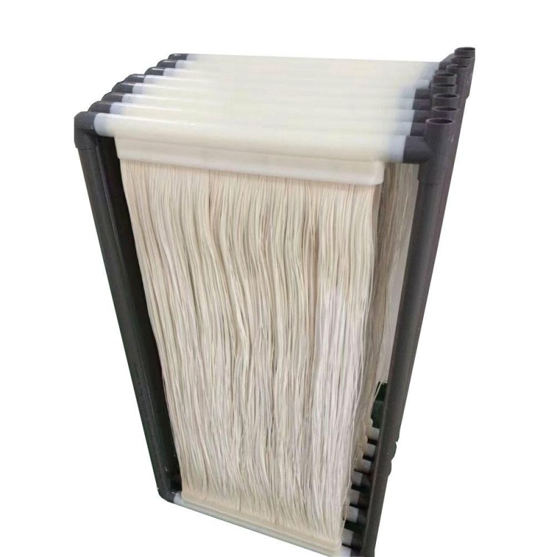 注明:該P(yáng)VDF膜為復(fù)合膜,內(nèi)部嵌入無(wú)紡支撐層,永不斷絲,抗污染性能好。該膜獨(dú)立單元為束狀,根據(jù)水量可任意排列組合成膜堆。
