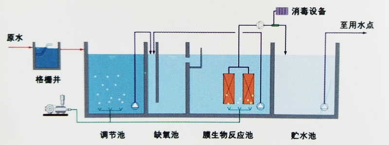主要有生物反應(yīng)器和膜組件兩個(gè)單元設(shè)備組成,運(yùn)行過(guò)程中,污水首先進(jìn)入到生物反應(yīng)器,污染物在生物反應(yīng)器中被微生物同化或異化,異化產(chǎn)物多為無(wú)害的CO?和H?O,同化物質(zhì)為微生物的組成部分;膜組件主要用于截留微生物和過(guò)濾出水。
